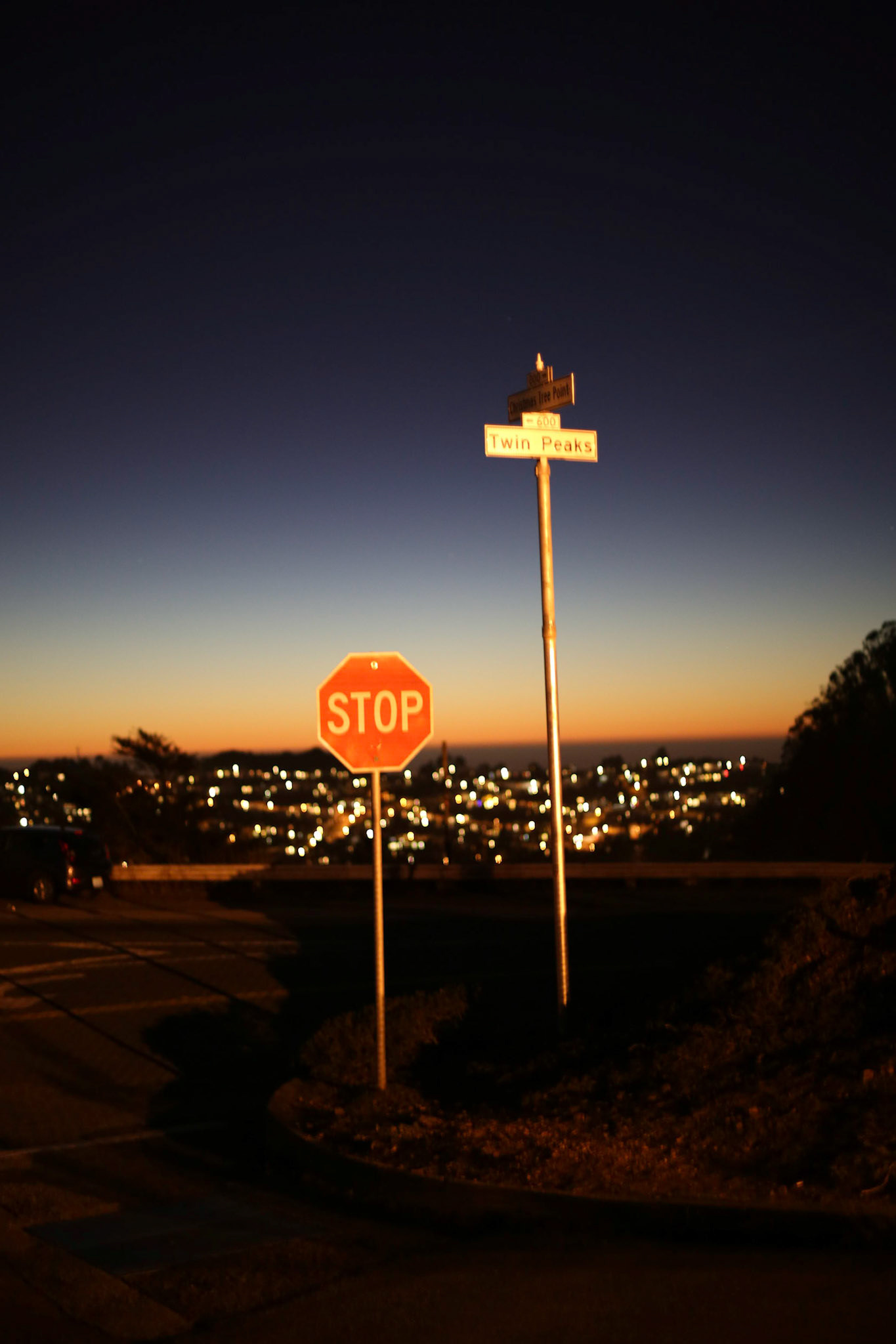 Blick auf San Francisco vom Aussichtspunkt Twin Peaks kurz nach Sonnenuntergang.